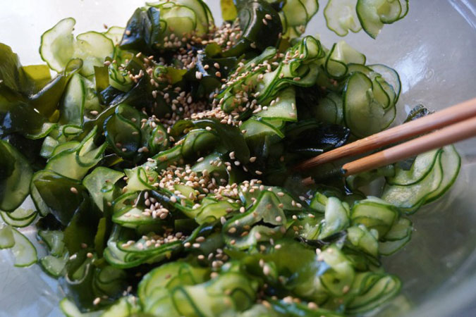 אופן ההכנה: משרים את האצות במים כחצי שעה ומסננים. פורסים את המלפפונים לעיגולים דקים. מערבבים עם האצות ויתר הרכיבים.