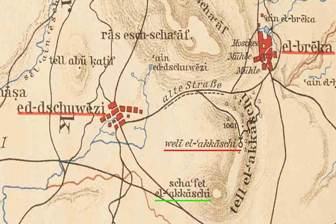 בתמונה: נבי עכאשה במפה ששרטט גוטליב שומאכר: המקום המוקדש לנבי מסומן מצפון לפסגה. בצד שמאל – הכפר הצ'רקסי ג'וויזה, כיום מדרום לאלוני הבשן, בצד ימין – הכפר ברייקה, הנמצא מזרחית לגדר הגבול של ימינו